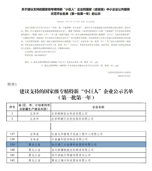5月10日,工业和信息化部公示了“建议支持的国家级专精特新‘小巨人’企业名单(第一批第一年)”,哈尔滨工大金涛科技股份有限公司成功入围。专精特新“小巨人”企业是指具有“专业化、精细化、特色化、高新化”特征的工业中小企业,也是相关行业内专注于细分市场、创新能力强、市场占有率高、掌握关键核心技术、质量效益优的“排头兵”企业。今年年初,财政部、工业和信息化部联合印发了《关于支持“专精特新”中小企业高质量发展的通知》。根据《通知》,中央财政中小企业发展专项资金将安排100亿元以上奖补资金,引导地方完善扶持政策和公共服务体系,分三批(每批不超过三年)支持1000余家国家级专精特新“小巨人”企业加大创新投入,推进高质量发展。