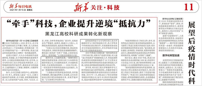 2021年1月15日,新华日报电讯报道了关于《“牵手”科技,企业提升逆境“抵抗力”》的新闻,新闻中报道了关于黑龙江高校科研成果转化新观察的内容,内容中包含了哈尔滨工大金涛科技股份有限公司的科研成果,下面小编为您摘录出新闻的部分内容。