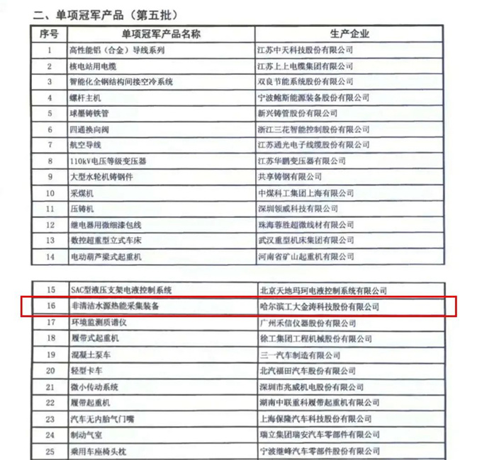 2020年12月21日,工业和信息化部办公厅公布第五批制造业单项冠军及通过复核的第二批制造业单项冠军,我公司哈尔滨工大金涛科技股份有限公司(以下简称哈工大金涛)产品(非清洁水源热能采集装备)入选单项冠军产品(第五批)。