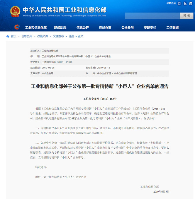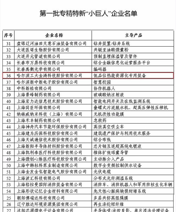 2019年6月13日,中华人民共和国工业和信息化部公布了第一批248家专精特新“小巨人”企业名单。哈尔滨工大金涛科技股份有限公司携主导产品“低品位热能资源化专用装备”成功入选。