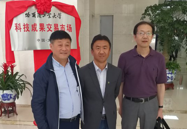 (图为:哈工大资产投资经营有限责任公司副总经理、哈工大附中理事程东明,哈工大校友总会办公室主任卢长发,哈工大金涛董事长李金峰合影。)